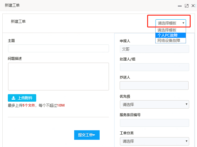 新建工單時,在右上角選擇工單模板,一鍵應用模塊快速創建工單。