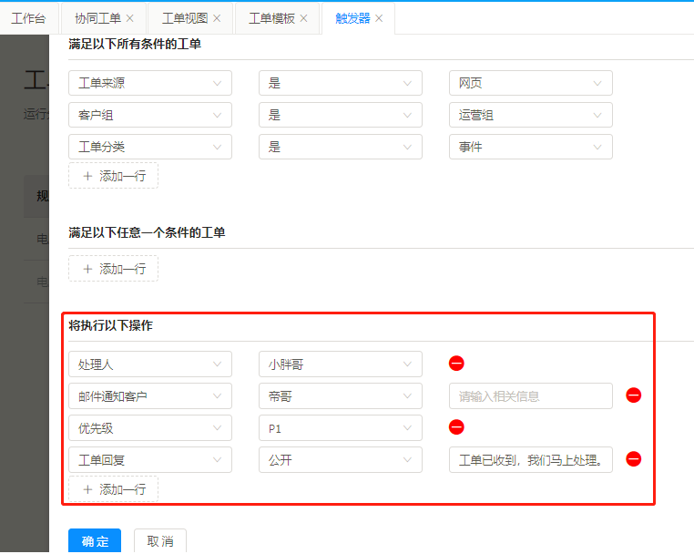 根據業務情況設置觸發條件,并配置需要執行的操作,確定保存生效。