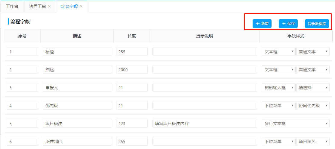在定義字段中,可以自定義設置協同工單頁面的字段內容。按照新增-保存-同步數據庫的步驟,即可為系統添加協同工單的字段(接下來在工單視圖中引用字段,下一小節我們會講到)。
