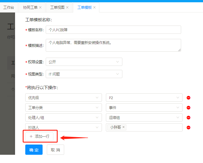 點擊添加工單模板,依次填寫模板的各項預置內容,在執行操作中,可以選擇工單的所有字段進行預置內容,點擊確定保存。