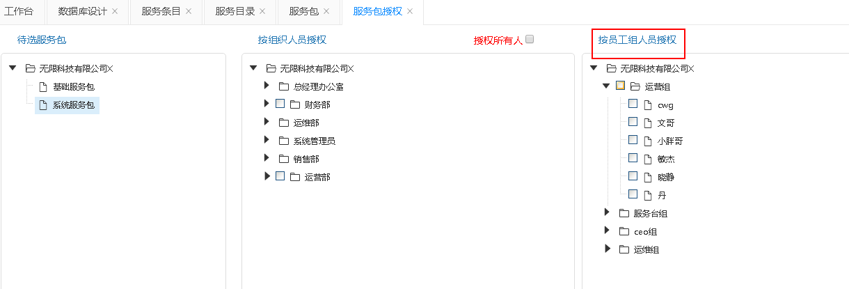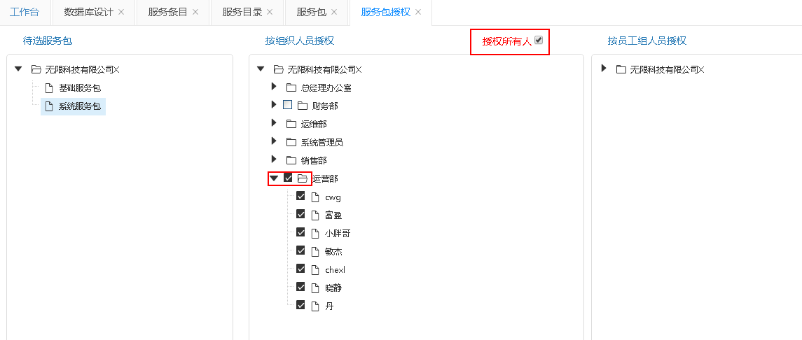 在按組織人員授權模塊中通過公司機構(gòu)的加載樹選擇員工,或者通過勾選父節(jié)點選中其下所有員工。這里,我們系統(tǒng)提供了一個便捷操作,即勾選授權所有人就能將服務包授權給公司里所有人