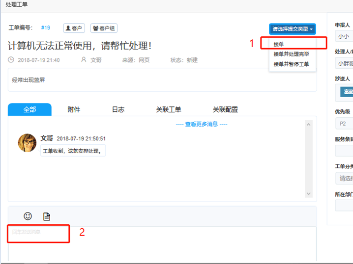 通常情況下,點擊接單后,在消息框內(nèi)反饋處理進度即可。