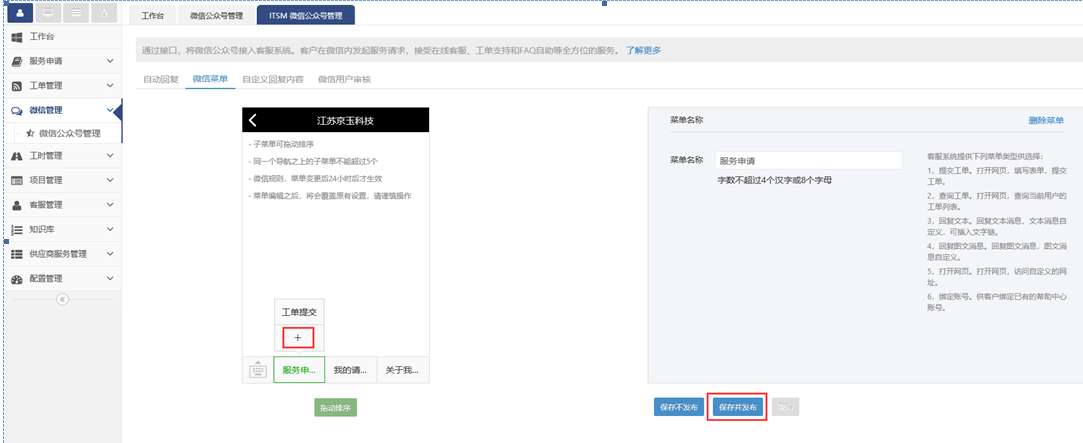 點擊上圖中的【+】按鈕,添加需要的微信菜單,添加完成后,可以點擊【拖動排序】按鈕對微信菜單進行拖動排序;如果需要發布,點擊【保存并發布】按鈕,可以在手機微信端看到相關的菜單信息,如下圖