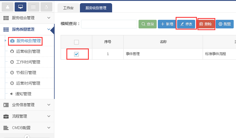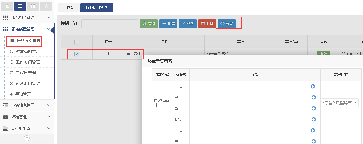 點擊新增。彈出對話框后,填寫名稱(如事件管理),在 流程的下拉框中選擇流程(如事件流程),可適當填寫描述,點擊保存。*頁面中的yes代表設置的這個服務級別生效。