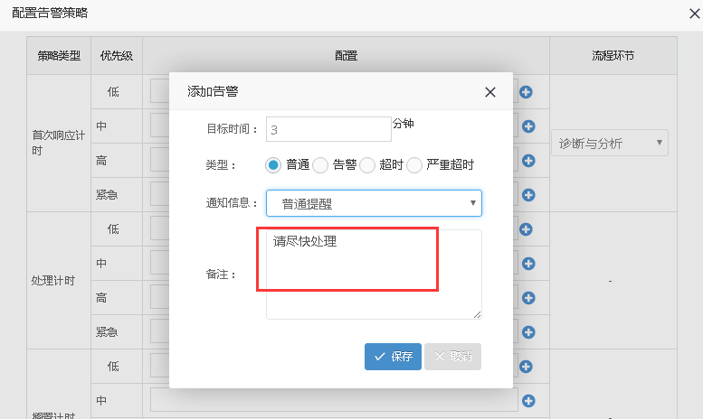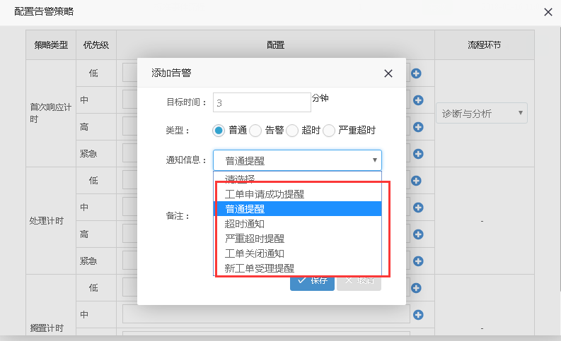 可以進行目標時間填寫,超出指定時間(給怎樣的通知),可以選擇通知的類型,比如普通,選擇通知信息,比如選擇普通信息,還可以備注,處理計時和擱置計時的設置同首次響應計時一樣,唯一不同的是右側不需要選擇流程環節。