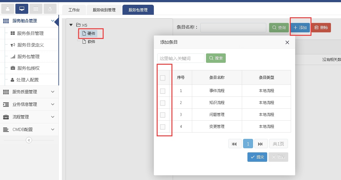 服務包添加服務條目:選擇一個服務包,在右邊列表處點擊添加。彈出對話框之后選擇服務條目,點擊提交(選擇了服務條目之后才可以使用條目里面的流程)