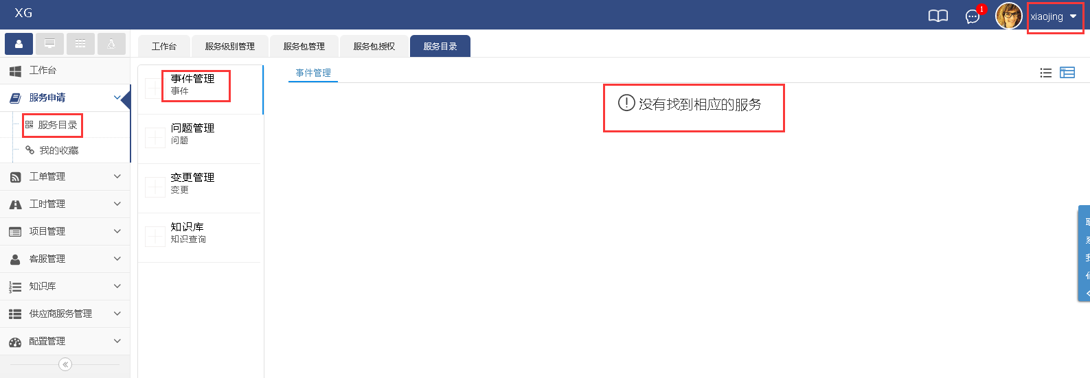 當xiaojing登錄系統之后,服務申請里點擊事件管理會出現沒有找到相應的服務(因為軟件這個包里沒有事件管理)