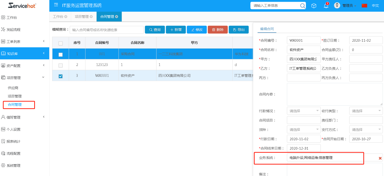 新增業(yè)務(wù)系統(tǒng)字段,本項目合同服務(wù)于哪些業(yè)務(wù)可以在該字段下進行選擇,配置好之后針對該項目報障的客戶,可以快速選擇業(yè)務(wù)系統(tǒng)。