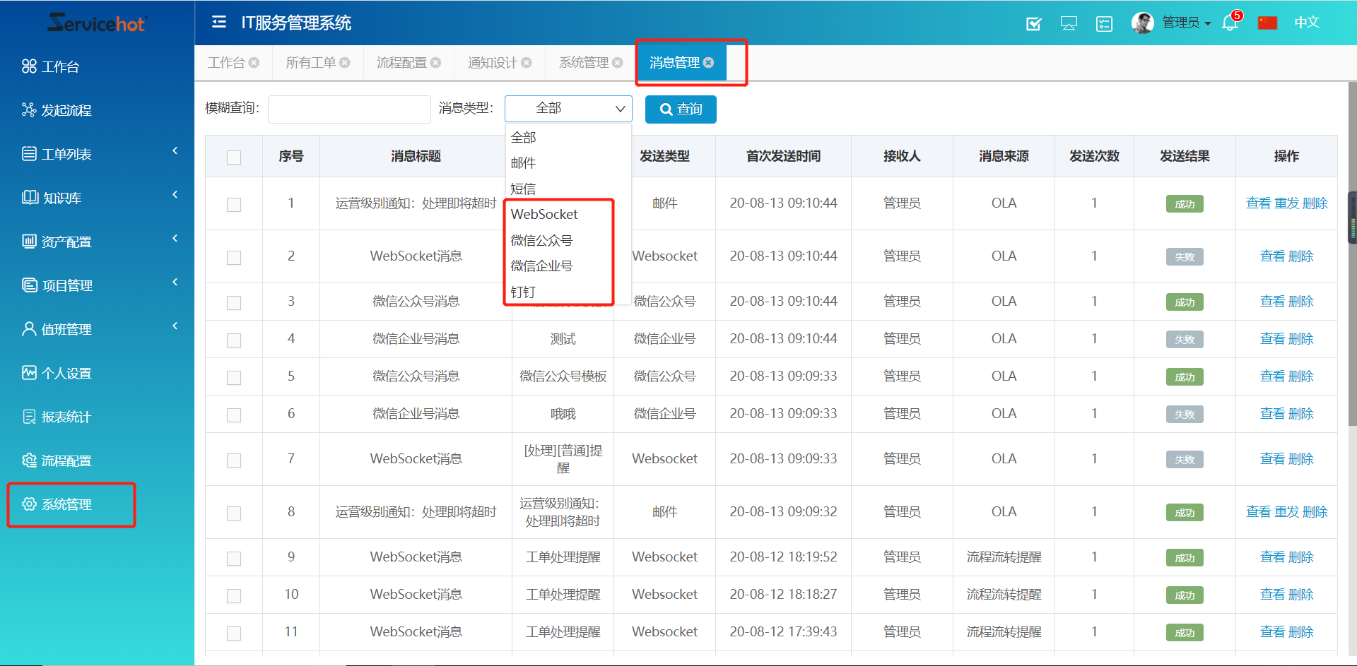 系統(tǒng)新增消息提醒方式,可通過郵件、短信、WebSocket、微信公眾號、微信企業(yè)號、釘釘?shù)攘N方式對用戶進(jìn)行消息提醒,更加多元化,符合不同企業(yè)需求。