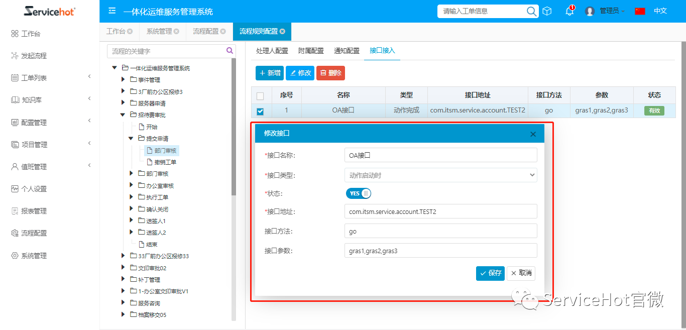 Servicehot產品為用戶提供基于webservice和API的標準接口,為便于管理員設計流程和接口,本次優化流程配置功能,管理員在配置流程規則時,可直接配置三方應用接口,實現流程多方聯動。