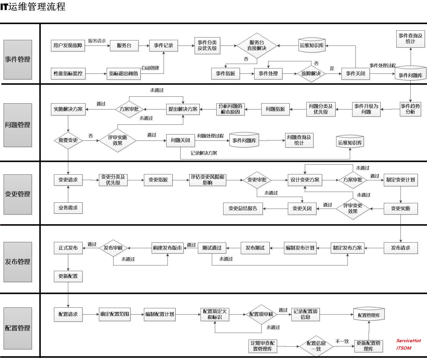 在ITILV3標(biāo)準(zhǔn)劃定的10個核心流程中,與服務(wù)支持相關(guān)的5個運(yùn)營級流程與IT系統(tǒng)結(jié)合比較緊密,屬IT運(yùn)維范疇。ServiceHot將IT運(yùn)維管理核心流程匯總?cè)缦拢?/span>