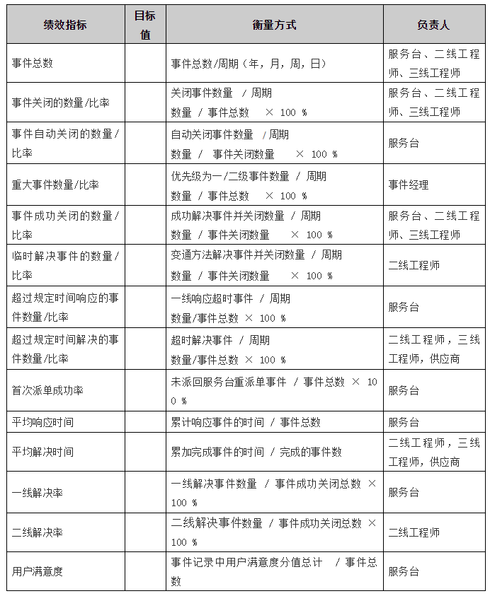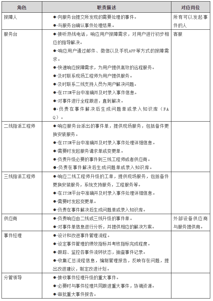 1. 所有已識別的事件都要被記錄,所有事件都有整體責(zé)任人(服務(wù)臺受理者),指派責(zé)任人(二線相關(guān)條線的主要負責(zé)人或受理人),以及當(dāng)前執(zhí)行人(具體負責(zé)該事件處理人),升級對象(三線或供應(yīng)商)。