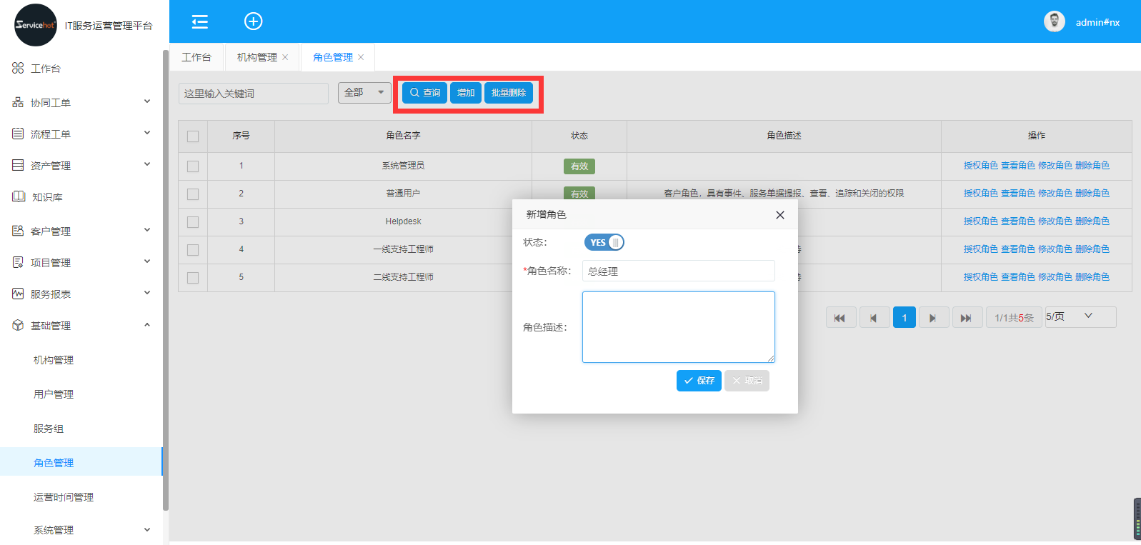 選擇「基礎管理」>>「角色管理」進入如下圖新增角色界面;