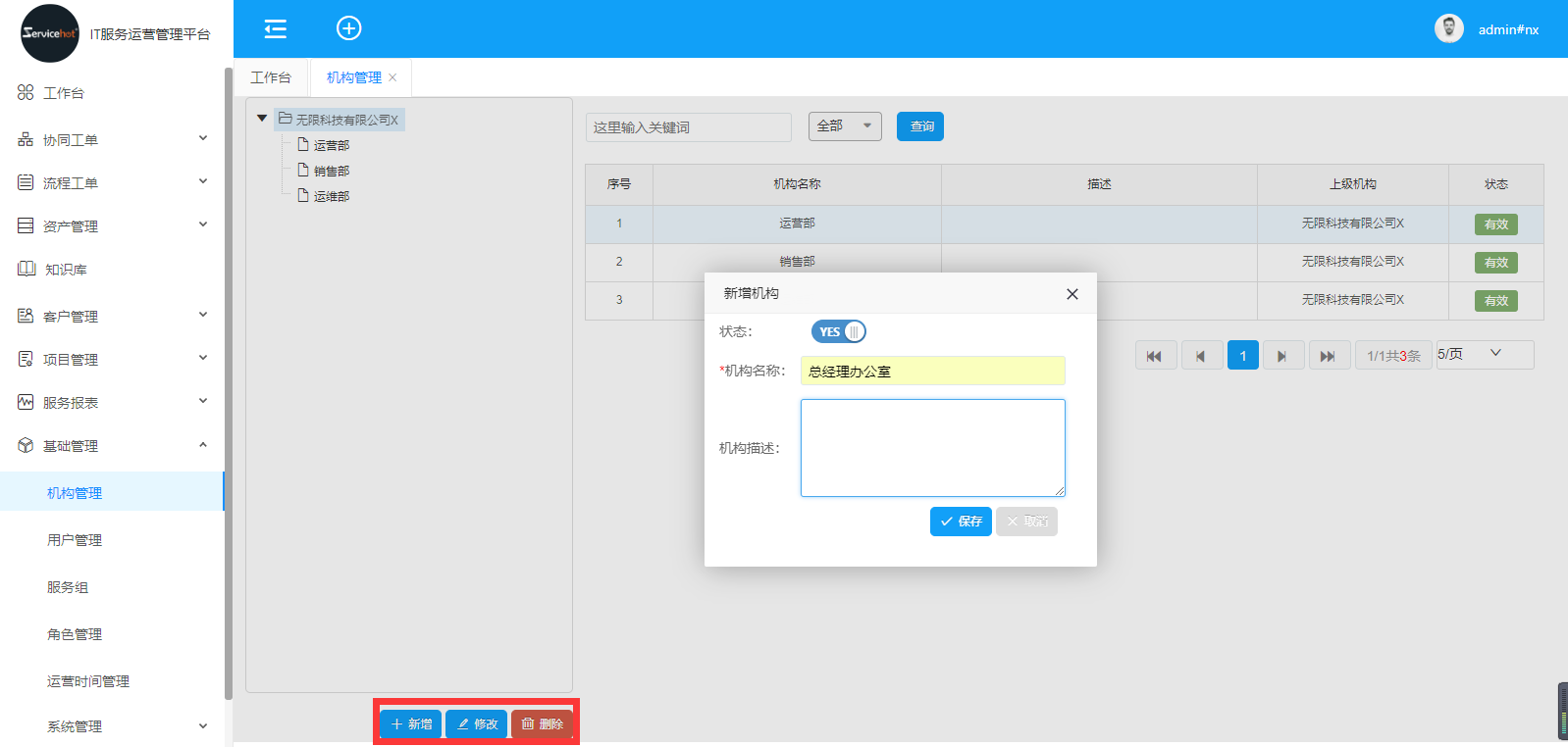 點擊“新增”按鈕,填寫新增的機構信息,點擊保存;